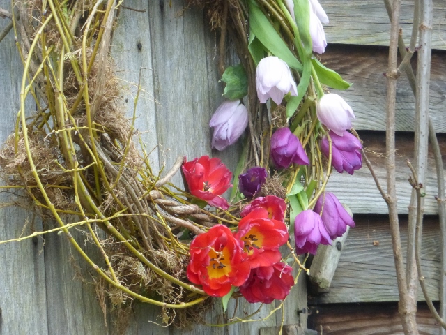 With the seed of an idea for a spring door wreath in mind I thought rather than let my tulips die in their vase, I’d see if I could get a day or two more out of them by creating a spring-themed door ring.